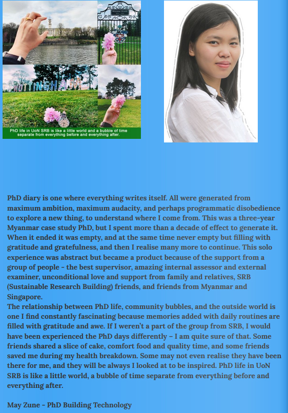 PhD diary is one where everything writes itself. All were generated from maximum ambition, maximum audacity, and perhaps programmatic disobedience to explore a new thing, to understand where I come from. This was a three-year Myanmar case study PhD, but I spent more than a decade of effort to generate it. When it ended it was empty, and at the same time never empty but filling with gratitude and gratefulness, and then I realise many more to continue. This solo experience was abstract but became a product because of the support from a group of people – the best supervisor, amazing internal assessor and external examiner, unconditional love and support from family and relatives, SRB (Sustainable Research Building) friends, and friends from Myanmar and Singapore.